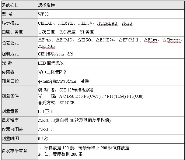 WF32色差儀是一款高精度、高穩定性、多功能的色差儀。WF32擁有8種測量光源(A、D50、D65、C、F2、F7、F11和F12);六種顯色模式(CIE1976LAB、CIEXYZ、CIELUV、HunterLAB、sRGB、白黃度);八種色差公式(△E*ab、△ECMC、△EISO、△ECIE94、△EFCMⅡ、△ELuv、△Ehunter、△EsRGB);三種語言模式(簡體中文、繁體中文和英文);有三種測量口徑供用戶選擇。WF32色差儀還能進行白黃度測量和平均測量,有大容量數據存儲空間,也可以外接微型打印機進行測量數據的實時打印,并能與儀器標配的《顏色分析系統》軟件配合使用。